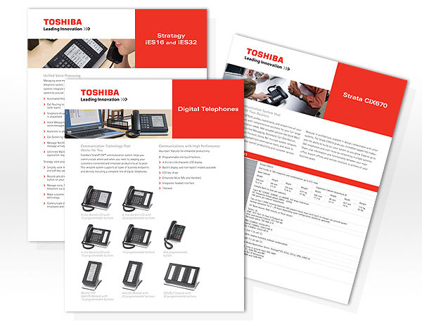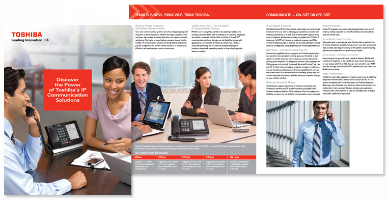 Product Brochures, Data Sheets, and Launch Kit for Toshiba's telecommunication systems. Art Direction / Photo Direction / Design / Production: Jerome Calleja Agency: JDA, Inc. Photography: Jim Purdum